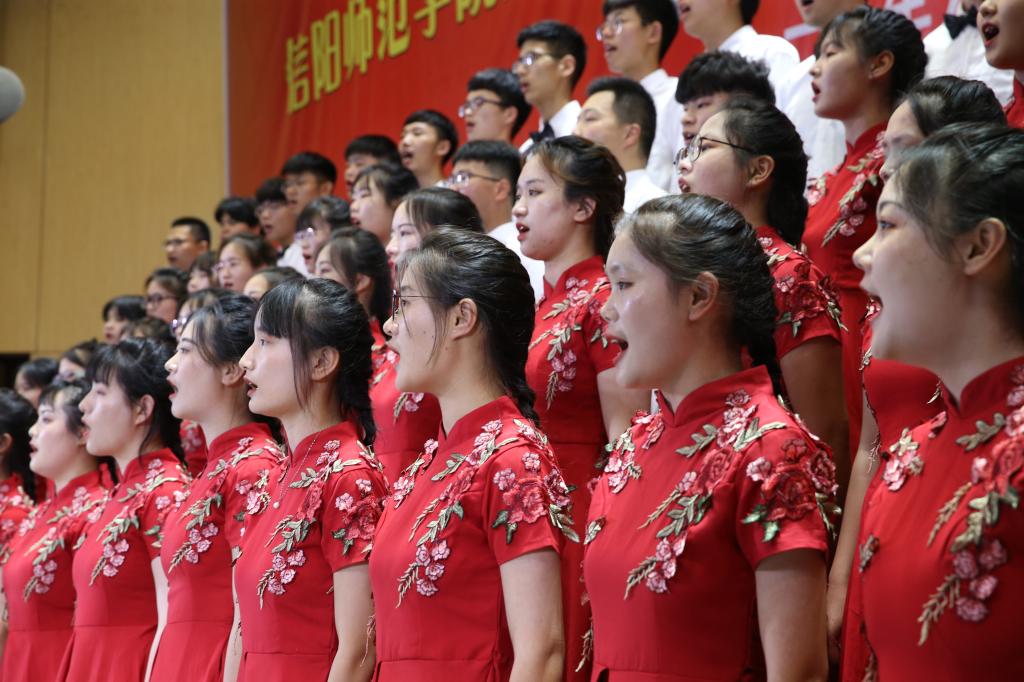 一首红歌,记录一段峥嵘岁月;一首红歌,象征一面光辉旗帜。《我爱你中国》《在灿烂阳光下》《保卫黄河》《在太行山上》《我的祖国》《不忘初心》《走向复兴》《红旗飘飘》《歌唱祖国》《国家》《看山看水看中国》《唱支山歌给党听》等歌曲或慷慨激昂、或雄浑奔放、或轻快欢畅……合唱团用满腔热情、真挚情感倾情演唱不时赢得阵阵掌声。通过合唱形式,让大学生在练习、巩固、演练的过程中探寻歌曲背后的故事和深刻内涵,引导广大青年学生在嘹亮歌声中追寻初心使命,在激昂旋律中坚定理想信念,在跳动音符里砥砺奋进步伐。