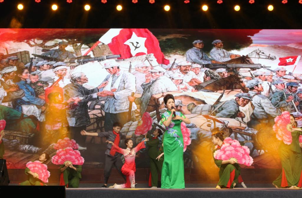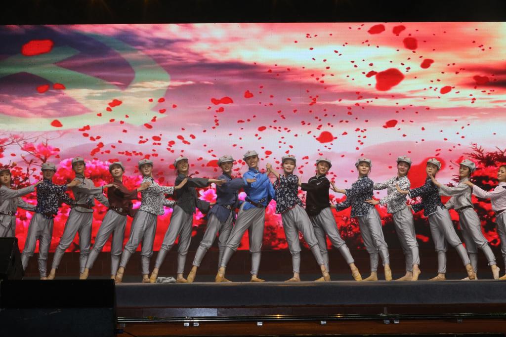 在“开天辟地”篇章中,情景剧《初心如磐》彰显了中国共产党坚守“为人民谋幸福,为民族谋复兴”而矢志奋斗的伟大壮举。歌伴舞《十送红军》生动刻画了军民一家亲的鱼水情,表达了革命根据地人民对红军的深厚感情以及对革命胜利的强烈盼望。歌曲《信仰的光芒》、舞蹈《血染杜鹃》赞扬了长征精神和大别山精神,激励广大师生奋勇前进。