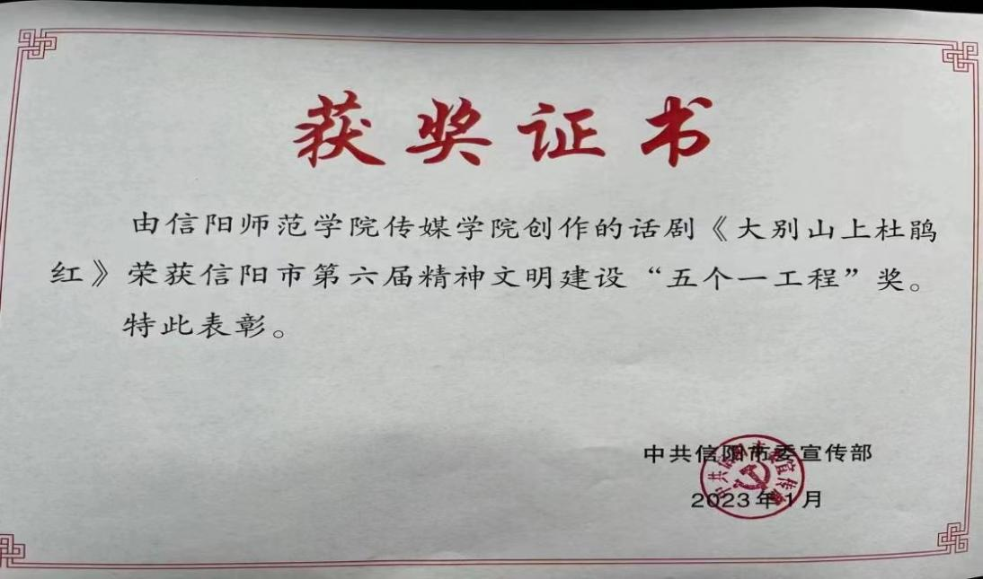 近日,信阳市第六届精神文明建设“五个一工程”奖评选结果公布,经过作品推荐、形式审查、初评审、终评审和部务会议讨论决定等程序,由金沙官网传媒学院师生原创的红色话剧《大别山上杜鹃红》从74部入围终评的作品中脱颖而出,成功获奖。