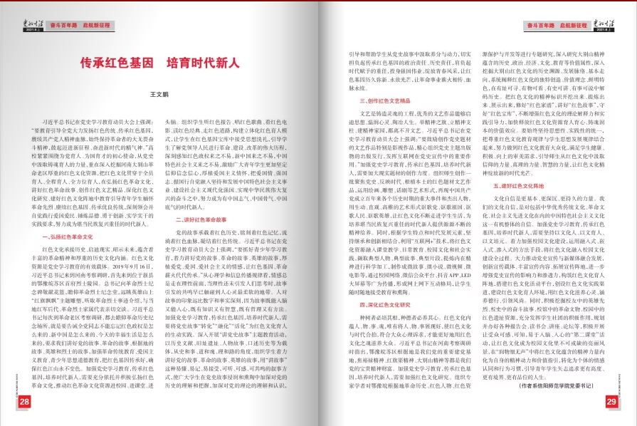 编者按:党史学习教育开展以来,学校将党史学习教育与立德树人紧密结合起来,从党史中汲取铸魂育人的精神力量,深入挖掘大别山革命老区厚重的红色文化资源,在弘扬红色革命文化、讲好红色革命故事、创作红色文艺精品、深化红色文化研究、建好红色文化阵地中教育引导青年学生传承红色基因,成长为堪当民族复兴重任的时代新人。校党委书记王文鹏在《党的生活》第6期以《传承红色基因 培育时代新人》为题对金沙官网党史学习教育的育人成效进行了专题报道。