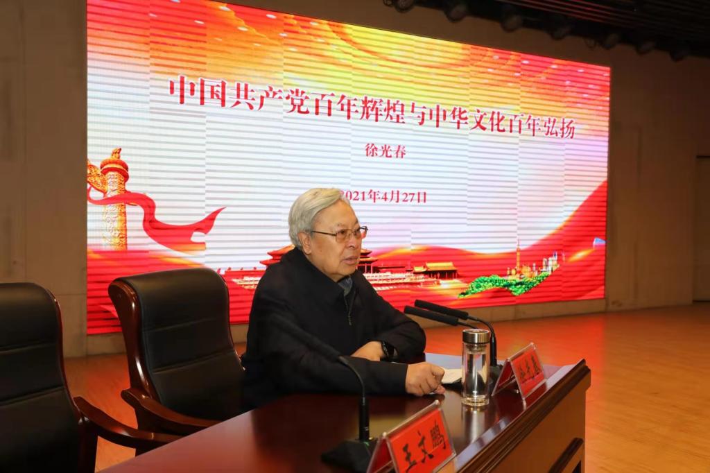 徐光春是马克思主义理论研究资深专家、中国传统文化研究著名学者、金沙官网炎黄学研究院院长,多年来一直致力于马克思主义理论、习近平新时代中国特色社会主义思想以及中国传统文化的研究与阐释,成果丰硕。报告中,徐光春以宽广的历史视野,回顾总结了中国共产党成立以来的三个光辉历程、三个伟大变迁、三个人间奇迹、十个方面的重要经验,全方位展现了我们党团结带领人民创造丰功伟绩的伟大奋斗历程。报告以辩证的历史逻辑,阐释了中华优秀传统文化为中国共产党百年辉煌提供的强大精神力量,中国共产党对其创新性发展创造的百年辉煌的伟大奇迹。以深刻的历史思考,剖析了一百年来中国共产党团结带领人民夺取伟大胜利的一个重要原因就是有坚定的文化自信。徐光春强调,进入新时代,要夺取全面建设社会主义现代化国家新胜利,仍然要始终不渝坚定文化自信,传承弘扬中华优秀传统文化,建设社会主义文化强国。