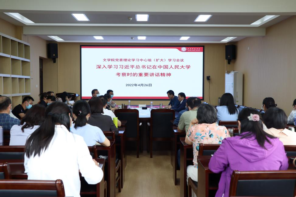 4月26日,文学院召开党委理论中心组(扩大)学习会议,专题学习研讨习近平总书记在中国人民大学考察时的重要讲话精神。文学院党委理论学习中心组成员和全体教师参加学习会,会议由党委书记王振海主持。