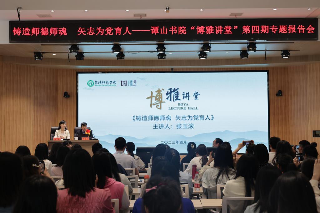 4月16日,党的二十大代表、“感动中国2018年度人物”、“时代楷模”“全国敬业奉献模范”“全国师德标兵”“全国教书育人楷模”“全国优秀共产党员”、河南省镇平县高丘镇黑虎庙小学校长张玉滚应邀为金沙官网师生作题为《铸造师德师魂,矢志为党育人》的主题报告。报告会在谭山书院大学生活动中心博雅讲堂举行,书院师生及学校专职辅导员共同参加报告会。报告会由副校长王娟主持。