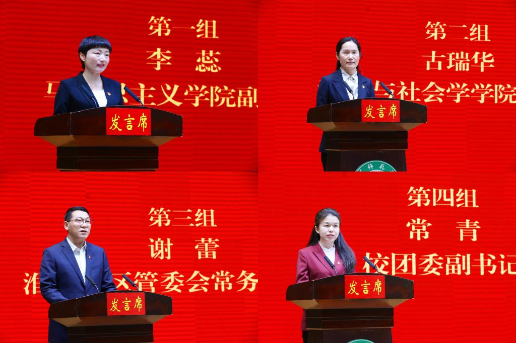 马克思主义学院副院长李蕊、法学与社会学学院副院长古瑞华、淮河校区管委会常务副主任谢蕾、校团委副书记常青、化学化工学院党委书记郭鹏、美术与设计学院党委书记兰洋、国际教育学院党委书记李舟、计算机与信息技术学院党委书记熊炎分别代表8个学习小组作大会交流发言。大家一致表示,经过三天的静心学习研读加深了对习近平新时代中国特色社会主义思想精髓要义的理解把握,进一步增强了坚定拥护“两个确立”、坚决做到“两个维护”的高度自觉,强化了奋力谱写高水平师范大学新篇章的使命担当。